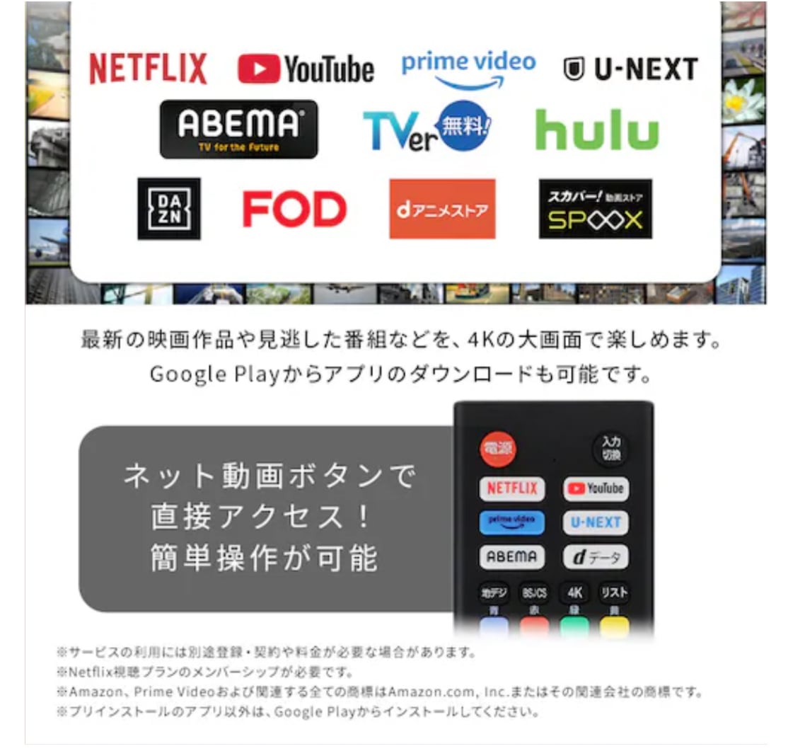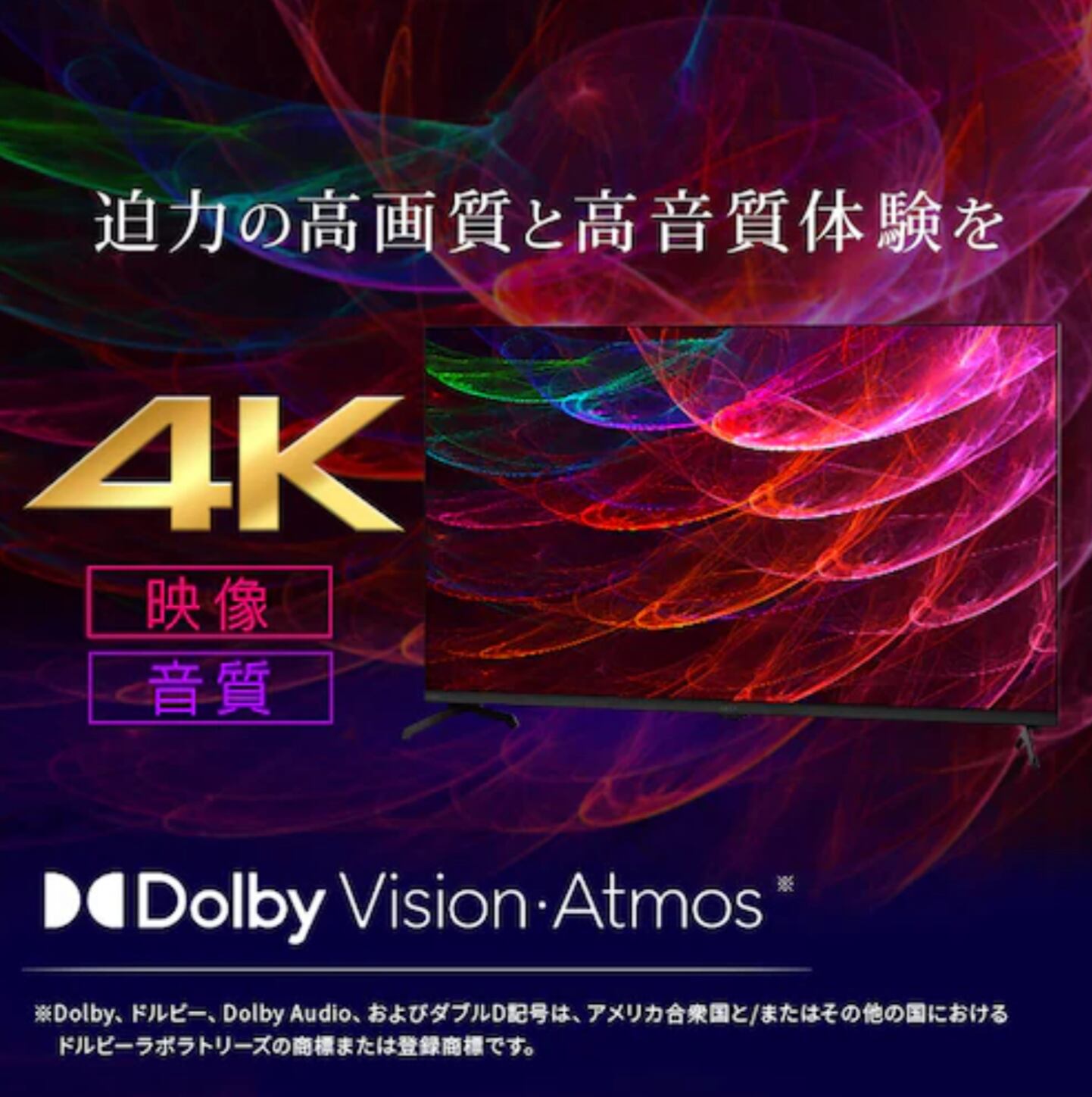 ●多様なコンテンツを4Kの美しい大画面に!豊富なネット動画サービスに対応。最新の映画作品や見逃した番組などを、4Kの大画面で楽しめます。GooglePlayストアからアプリのダウンロードも可能です。Dolby Atmos対応の音声処理システムにより、テレビ本体のスピーカーだけで簡単に立体音響を楽しめます。