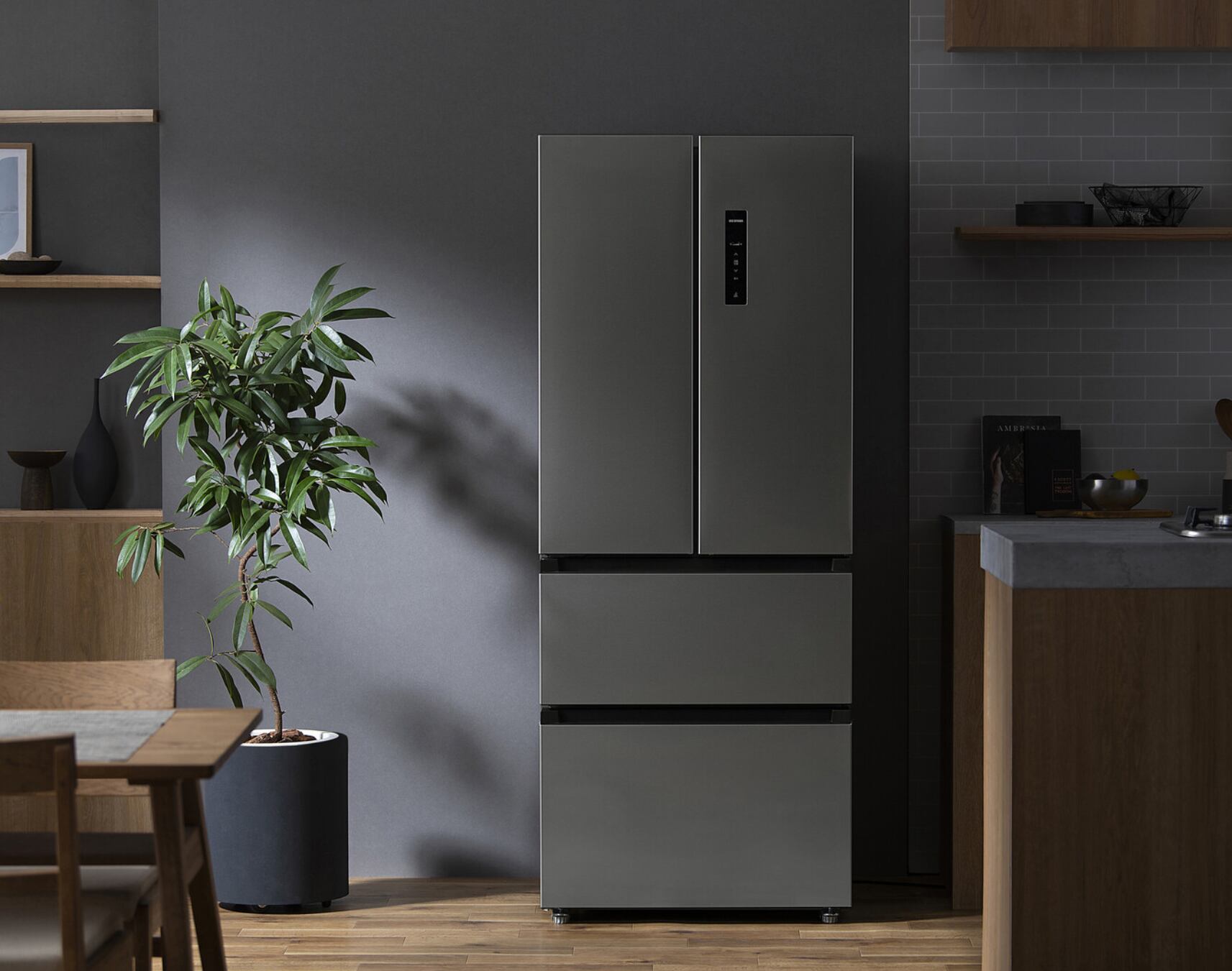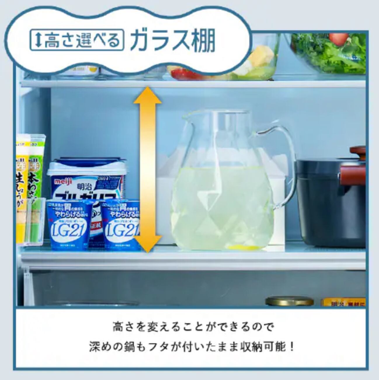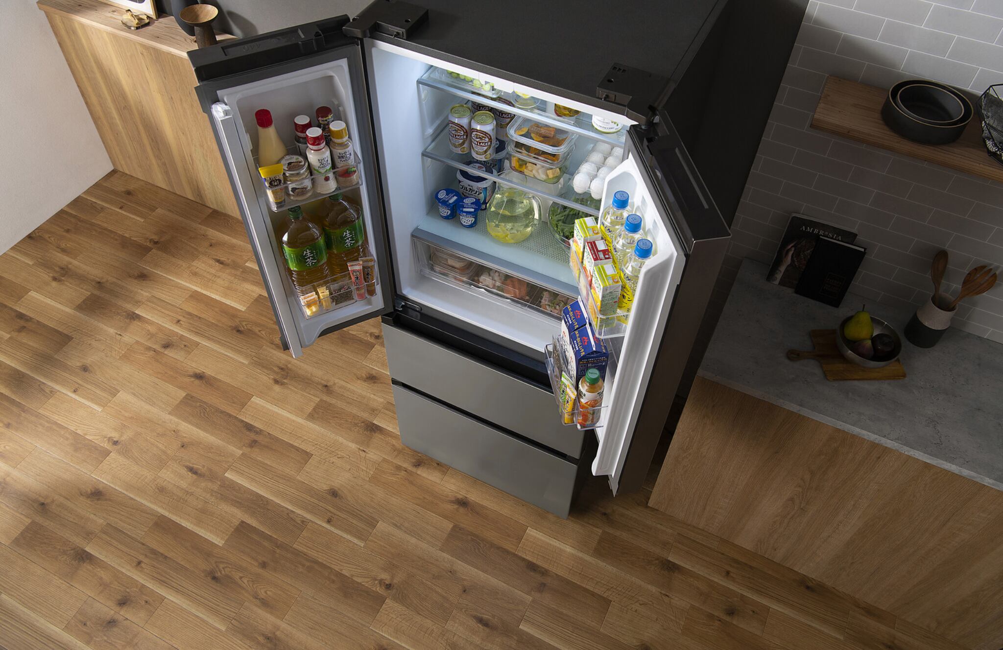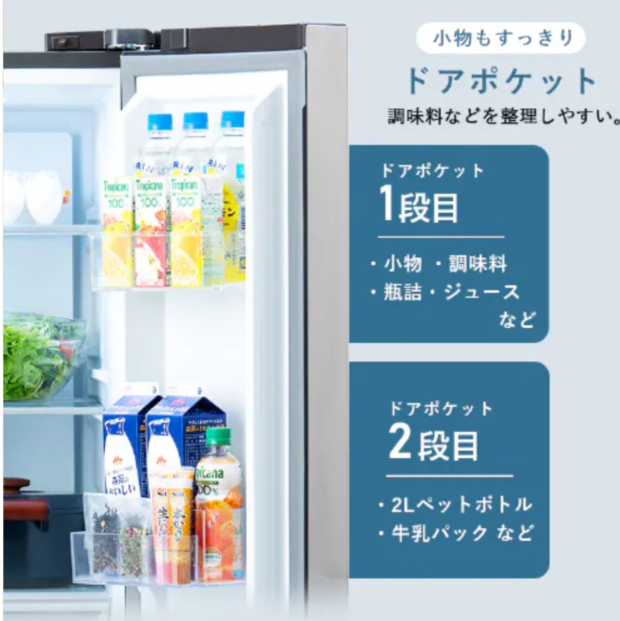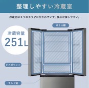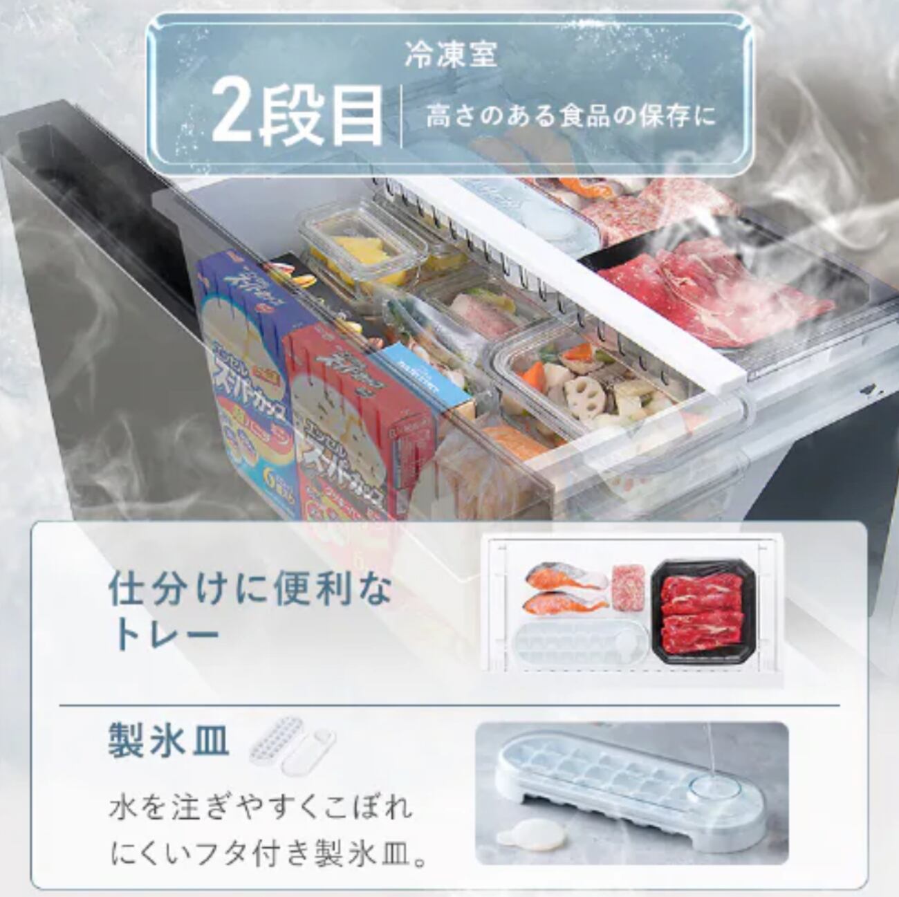 ●2段冷凍室で大容量の150L!作り置き食材などをたくさん冷凍保存でき、より快適な暮らしをサポートします。冷凍室上段は可動式の仕切り付き冷凍室仕様なので冷凍食品を立てて収納でき、下段にはスライドトレイがあるので製氷皿が置けます。ドアポケットに調味料やチューブ用に設計された小物収納付き!冷蔵庫開閉時に調味料が倒れず綺麗に収納できます。操作パネルで、ドアを開けずに庫内の設定温度の調節や冷蔵急冷モード・冷凍急冷モード・全室急冷・通常運転の切り替えができます。フレンチドアモデル&4ドアで使う場所を選ばない冷蔵庫です。間取りによるドアの開閉方向を気にしなくてOK!汚れてもサッと拭き取りやすく傷つきにくい、高級感のある鋼板のデザインでキッチンと馴染みます。ガラス製の棚なので拭き取りやすく、臭い移りも気になりません。
