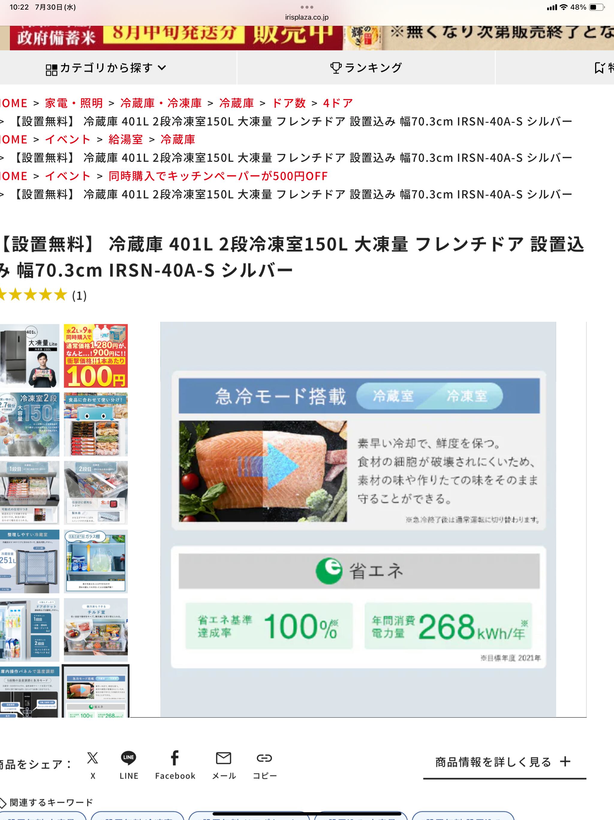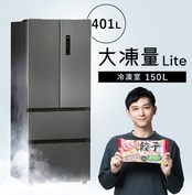 ●●定格内容積:【全体】401L、【冷蔵室】251L、【冷凍室】150L●冷凍室の性能:【記号】フォースター、【冷凍室負荷温度(食品温度)】-18℃以下、【冷凍食品の保存期間の目安】約3か月●定格電圧:AC100V●定格電源周波数:50/60Hz●霜取装置入力:185W●年間消費電力量:268kWh/年●省エネ基準達成率:100%●コードの長さ:約2.1m●冷却方式:ファン式●付属品:製氷皿●保証期間:お買い上げ日より1年間