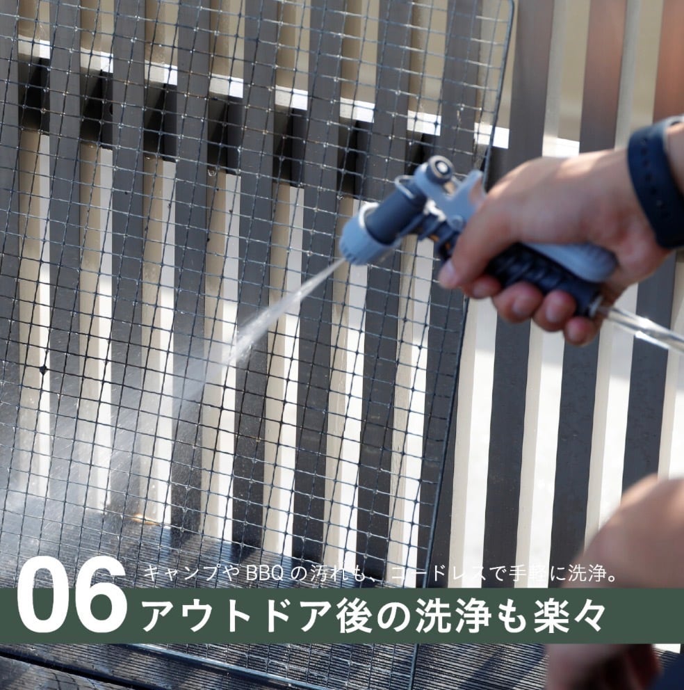 防水規格IPX6に準拠しており、屋外使用も安心。強い水しぶきにも耐えられるタフな構造で、洗車やガーデニング、キャンプなどでも活躍。3mの距離から毎分100リットル・100kPaの水を3分間浴びせても動作に影響がない高い防水性を備えています。