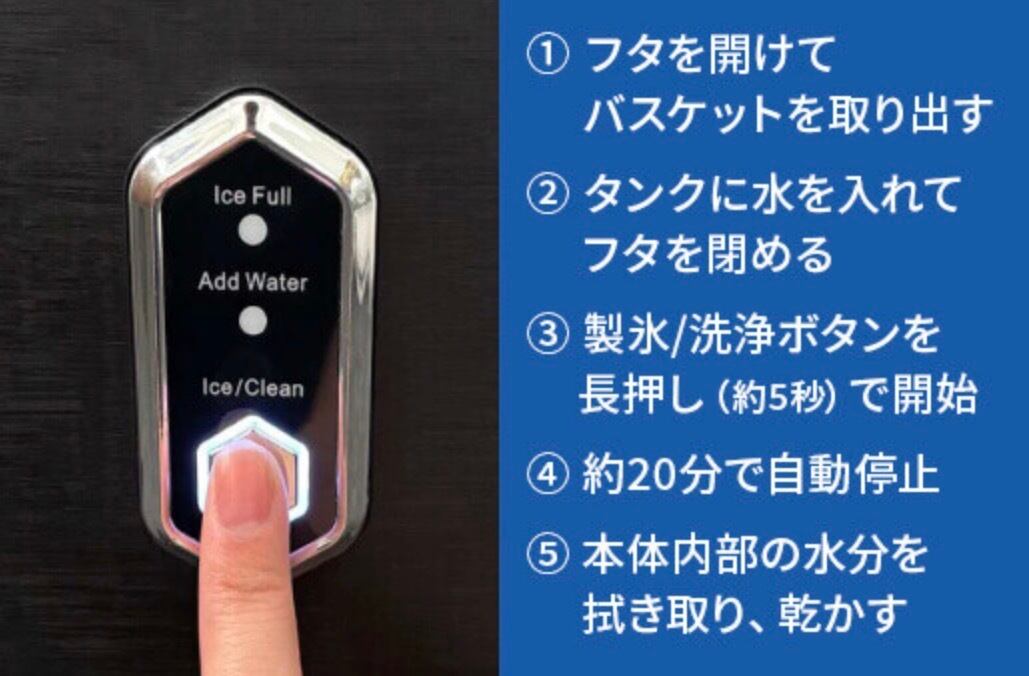 製氷/洗浄ボタンを長押し(約5秒)すると洗浄モードになります。