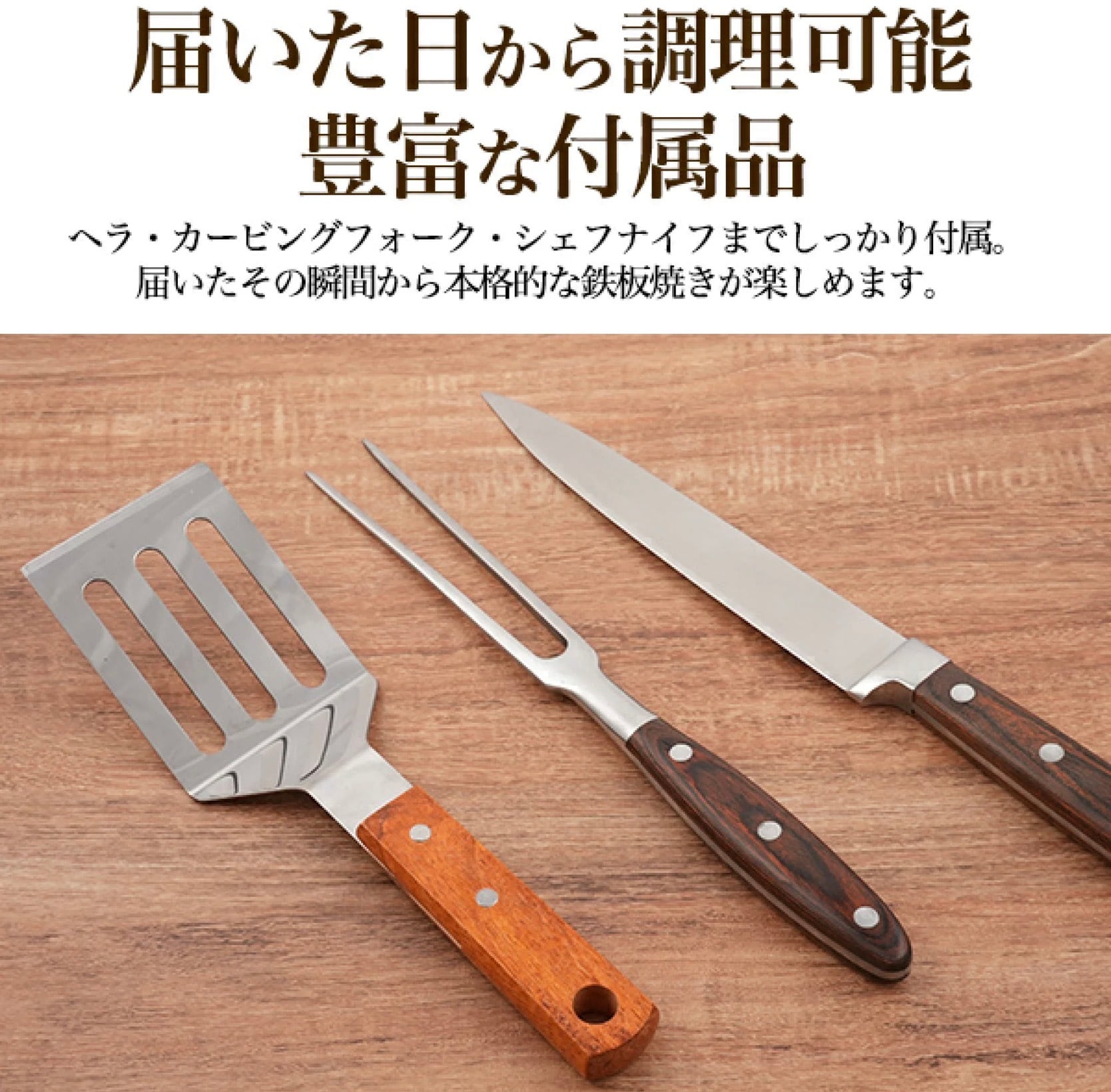 ヘラ・カービングフォーク・シェフナイフまでしっかり付属。 届いたその瞬間から本格的な鉄板焼きが楽しめます。